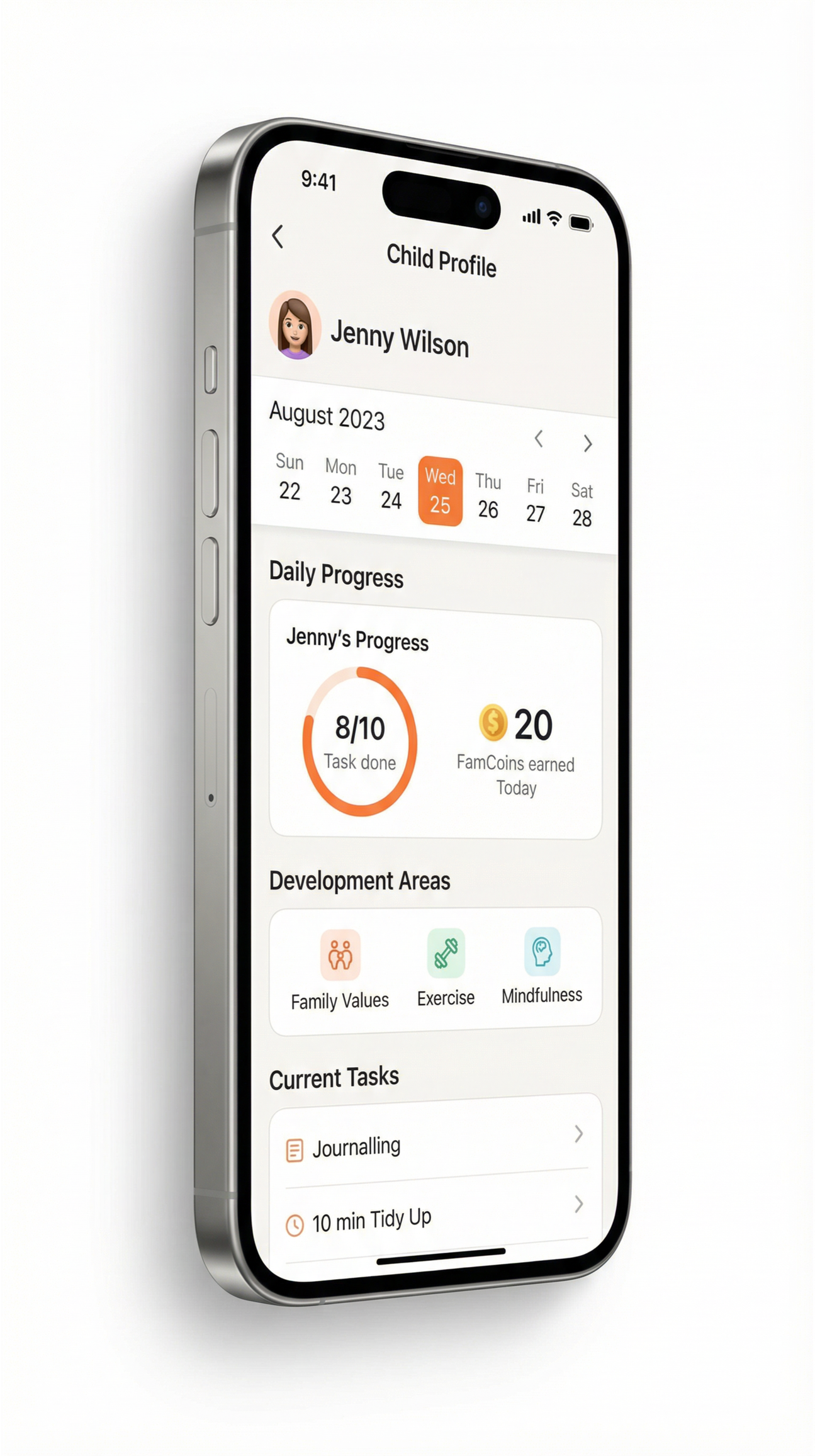 Famify implements and tracks daily activities based on seven core principles of wellbeing.